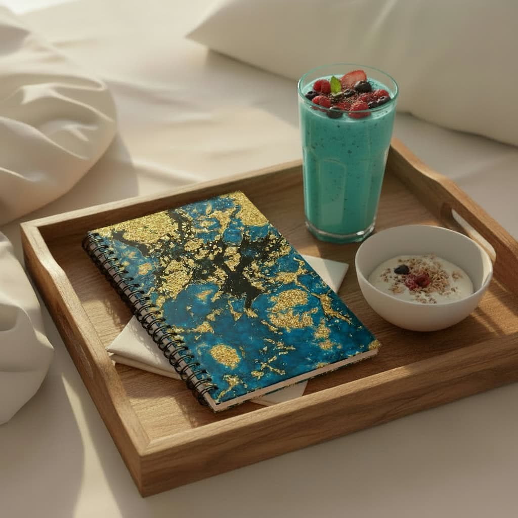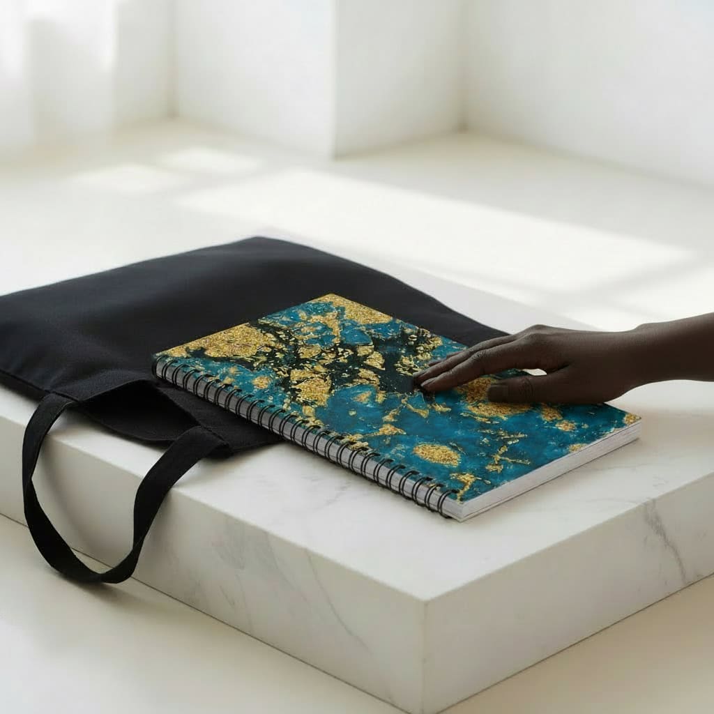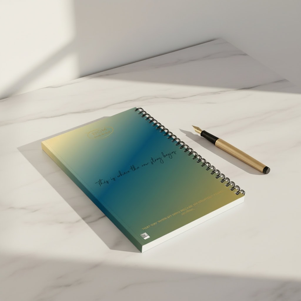 The blank page symbolises a mind full of unexplored beauty and power. A gradient that moves from calm teal to golden light, a visual reminder that healing moves in both directions. Marble veining runs through the design, Kintsugi made visible, a reminder that broken things become beautiful when held with intention.